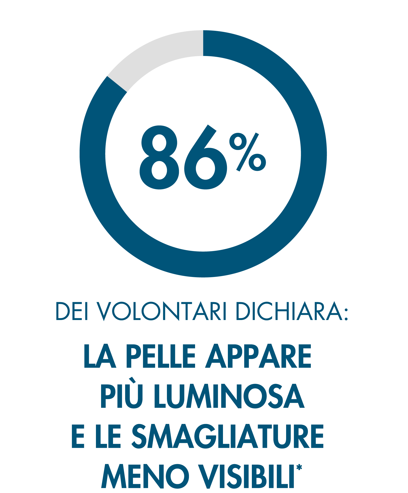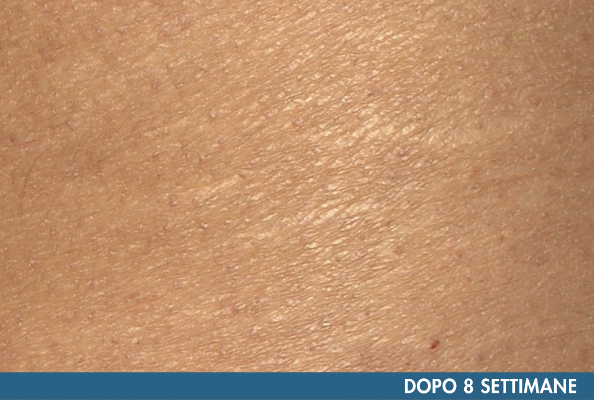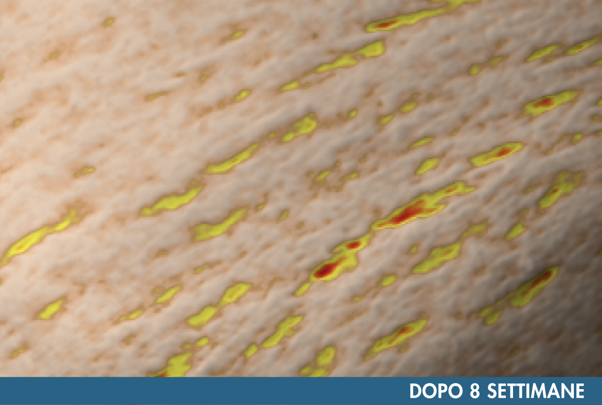 Test clinico strumentale condotto da laboratorio indipendente su 30 volontari, età 22-62 anni, con pelle secca o molto secca e smagliature. Il prodotto è stato applicato nelle zone d’interesse 1 sola volta. Foto prima e dopo ottenute con Antera 3D. Valore medio. Test clinico strumentale condotto da laboratorio indipendente su 30 volontarie, età 22-62 anni, con pelle secca o molto secca e smagliature. Il prodotto è stato applicato sul corpo 2 volte al giorno, mattina e sera, per 8 settimane. Valore medio. Foto prima e dopo ottenute con Antera 3D. Valore medio. *Test di autovalutazione condotto da laboratorio indipendente su 30 volontarie di età 22-62 anni, con pelle secca o molto secca e smagliature. Il prodotto è stato applicato 2 volte al giorno, mattina e sera, per 8 settimane.RISULTATI